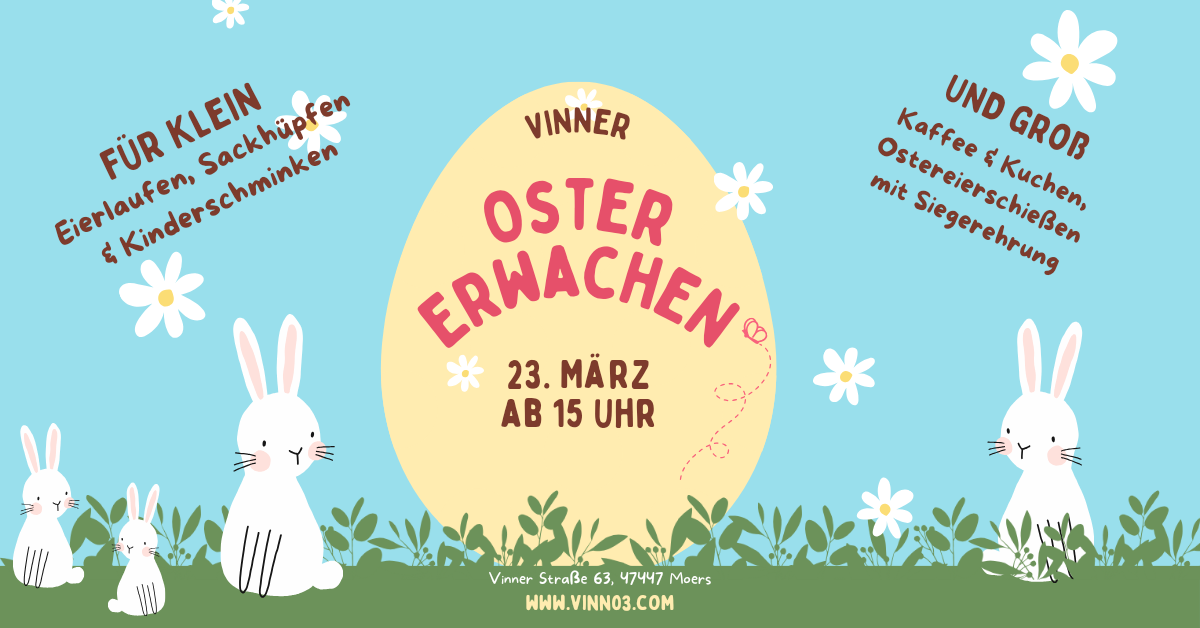 Willkommen zum alljährlichen Ostererwachen in Vinn! Wir freuen uns, Euch am 23. März ab 15 Uhr auf der Vinner Straße 63, 47447 Moers begrüßen zu dürfen. Es wird eine aufregende Zeit für Jung und Alt, mit vielen lustigen Spielen und leckeren Leckereien.